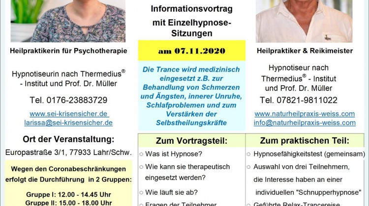 Am 07.10.2020 können Sie das erfahrene Hypnoseteam in Lahr/Schw.